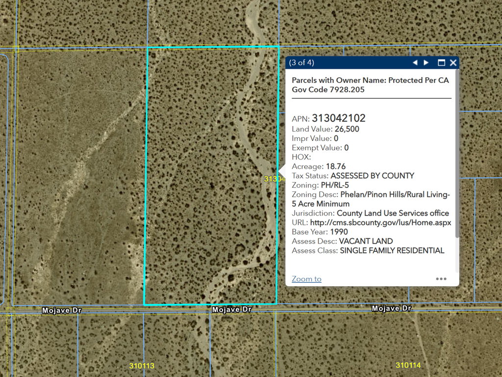 Embrace the great potential of this beautiful 18.76 acres lot (county parcel map shows 19.48 acres) in Phelan. This lot is directly fronting Mojave Drive and not too far from paved Sheep Creek Road. Power lines are on Sheep Creek. Private well and septic tank are necessary and common in the area. Adelanto, Victorville and everything you need is just a short drive away. This lot is zoned for PH/RL-5 (Rural Living) which allows for single family homes and incidental agriculture uses. There is also potential to be subdivide it to multiple smaller lots too. This is really an unique opportunity to enjoy a peaceful desert lifestyle with expansive open spaces and breathtaking natural beauty.